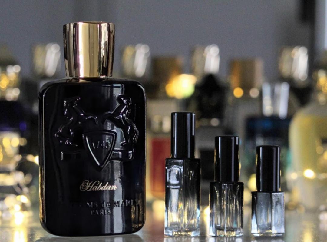 Description: Habdan is a rich and charismatic "Amber Vanilla" (or Oriental Spicy) fragrance that strikes a masterclass balance between sweet, spicy, and resinous. Inspired by the noble Habdan stallion—a symbol of grace and strength—this scent is often considered one of the more "mysterious" offerings from Parfums de Marly. It opens with a dry, aromatic blend of saffron and frankincense but quickly introduces a signature crisp apple note that adds a fresh, slightly gourmand edge. As it dries down, it becomes warm and balsamic, featuring a "burnt sugar" sweetness from maltol and the earthy depth of myrrh. It is highly versatile but excels in cooler weather and evening settings.
